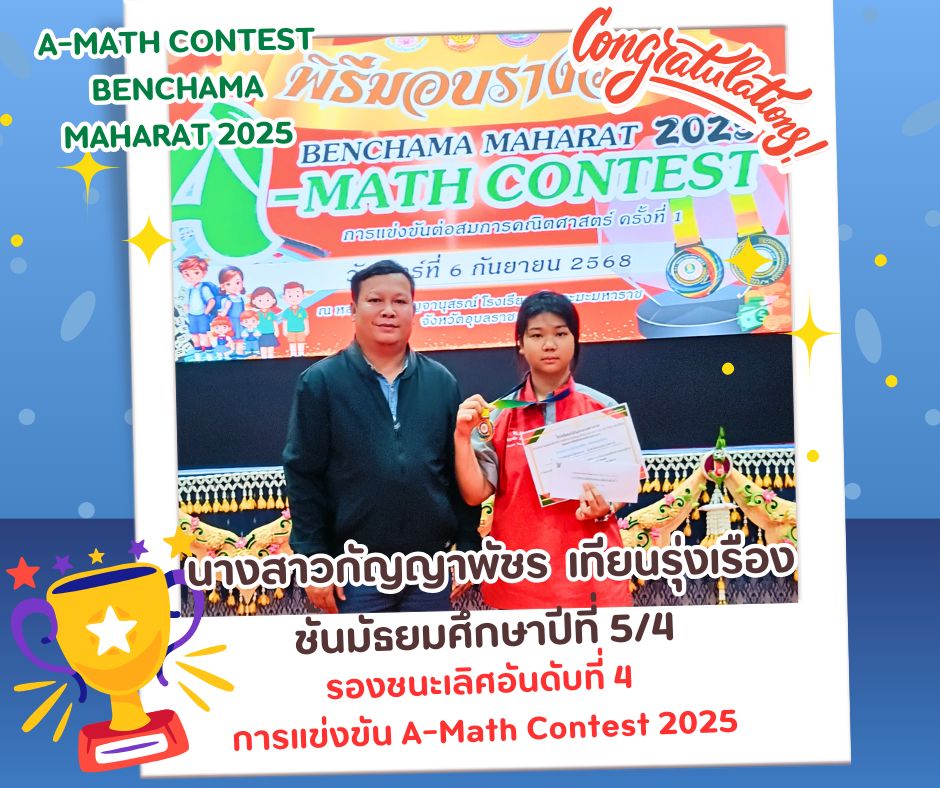 Print | Hits: 14ขอแสดงความยินดีกับ นางสาวกัญญาพัชร เทียนรุ่งเรืองนักเรียนชั้น ม.5/4 รางวัลรองชนะเลิศอันดับ 4 การแข่งขัน A-MATH CONTEST 2025 ณโรงเรียนเบญจะมะมหาราช ครูผู้ฝึกสอนนายศิวพล โทนผุย